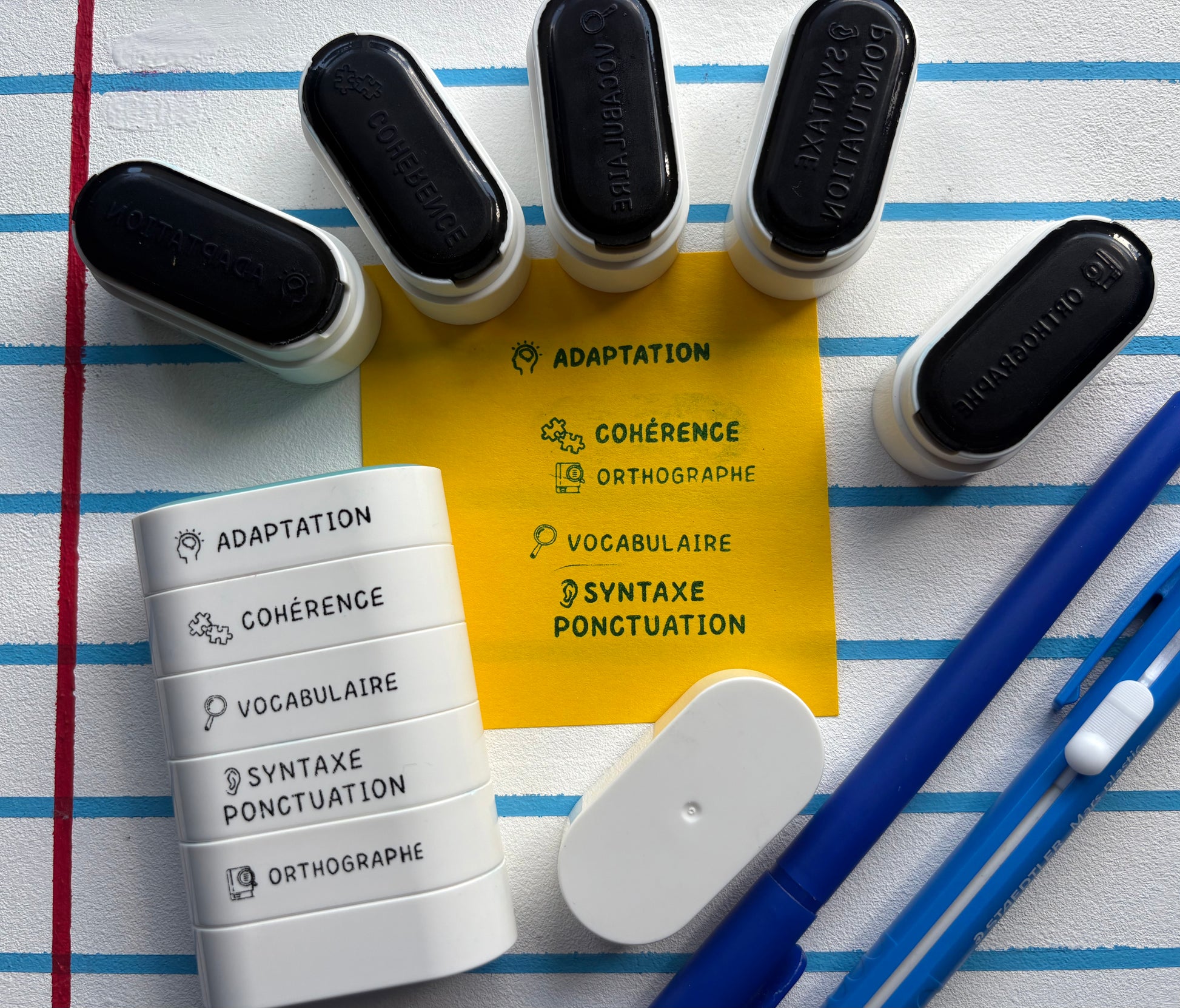 Simplifiez et dynamisez vos corrections avec l’étampe 5 en 1 – Critères d’écriture. Choisissez précisément les critères à corriger : adaptation, cohérence, vocabulaire, syntaxe/ponctuation, orthographe. Que vous en corrigiez un ou tous, vos rétroactions deviennent claires, rapides et professionnelles. Un outil essentiel pour gagner du temps et alléger vos corrections au quotidien.
