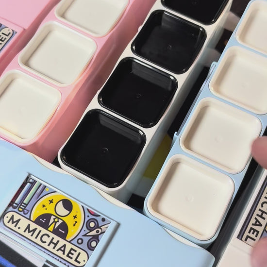 Cette étampe 4 en 1 personnalisée comprend quatre étampes carrés intégrées dans un même boîtier.